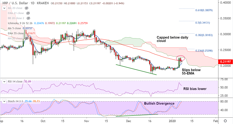 XRP/USD trades subdued below 55-EMA as the pair fails to hold gains on the day.