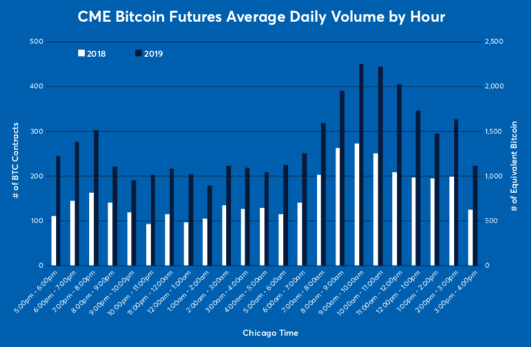 ADV increased 75% between 2018 and 2019 with record volume of 33,677 contracts on May 13, 2019 (refer 1st chart). Around 6,370 contracts, 2019 YTD ADV (31,850 equivalent bitcoin).