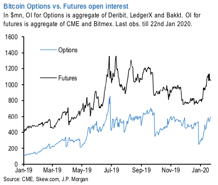 For options, by contrast, there is less reason to expect such a divergence to persist, as margins are not used in the same way to gain leverage as for futures. Also, some hedge funds who do not necessarily have a fundamental view on bitcoin direction could see opportunities in trading volatility. The CME’s reputation and credibility in US derivatives markets more broadly could be a substantial advantage in attracting those potential market participants. Courtesy: JPM