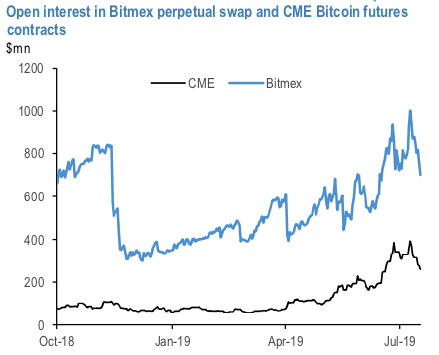 How big are the above contracts? The 1st chart depicts the open interest of these two contracts. The open interest is more than double at Bitmex (around $700mn currently vs around $300mn for CME) which reflects the success of the Bitmex contract in concentrating liquidity over the years, by starting earlier and by allowing investors to lever a lot more than CME for up to 100x. Average weighted leverage is admittedly lower than that, around 25x, but still ten times higher than the 2.5x allowed by CME.