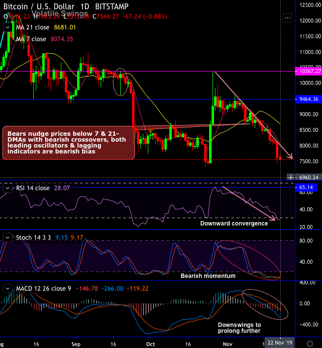 The bitcoin price trend has been struggling of late, BTCUSD price (at Coinbase) has plunged below $8k levels (refer above chart), currently trading at $7,536 levels with intensified selling momentum.