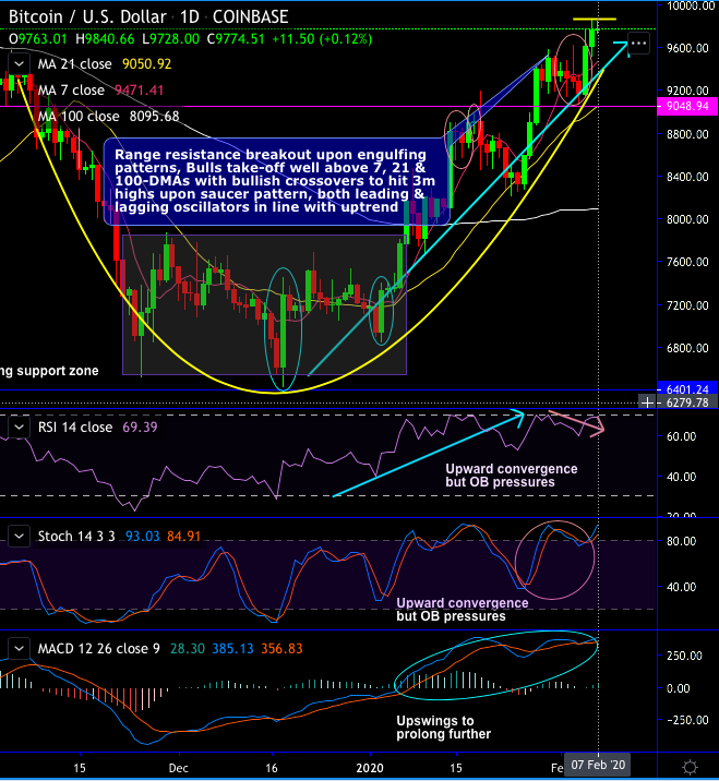 Bitcoin’s bullish streaks have parked at $9,857 level, currently flirting with price band between $9,728 - $10k areas. We had explicitly traced our bullish indication and advocated long build-ups on December 2nd. Ever since then, it’s been 53% price jump so far and 35% in 2020. The pair rallied from $6430 (Dec. lows, that is when we recommended fresh long build-ups) to recent highs of $9,857 level.