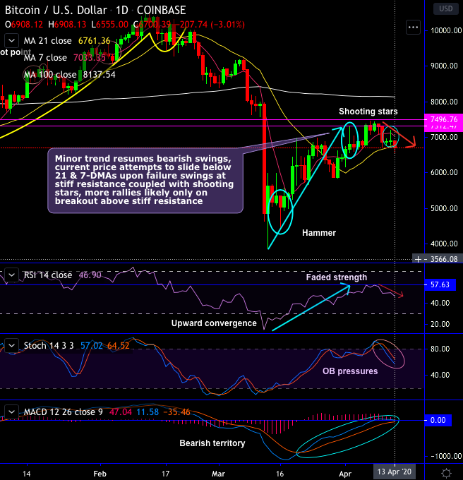 Consequently, the minor trend resumes bearish swings, while the current price attempts to slide below 21 & 7-DMAs upon the failure swings at this stiff resistance coupled with shooting stars at 6,804.52 and 6,908.13 levels. For now, more rallies likely only on breakout above this stiff resistance zone.