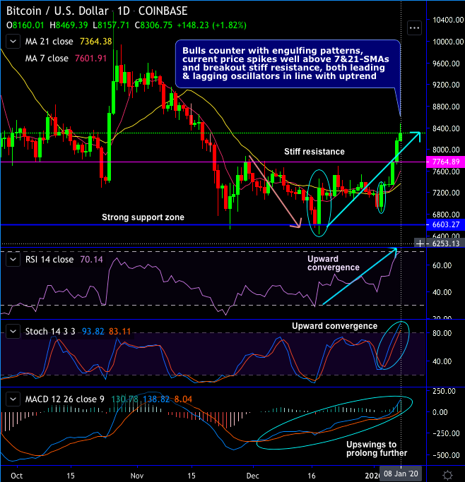 As there was a higher low than the asset’s previous cycle low of US$6,500 which it hit in mid-December 2018, and the current price has broken out stiff resistance of $7,764 and hit $8,000 levels, now is on the verge of $8,500 level. We could now foresee further upside traction as both leading & lagging oscillators in line with uptrend (refer daily chart).