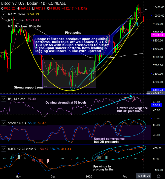 Bitcoin bullish price rout has completed saucer pattern chart formation and now halted at $10,522 level, the trend seems to be exhausted a bit to plunge below 7-DMAs and $10k level. Currently, hovering at 21DMAs, any sustenance can regain strength and stimulate rallies or breakdown below this pivot point may drag further slumps upto 9,000 areas.