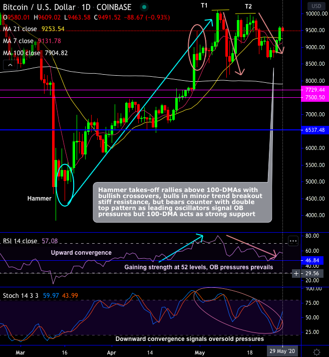 Technically, bulls have disrupted the formation of double top pattern, while hammer takes-off rallies above 100-DMAs with bullish crossovers. Bulls in minor trend breakout stiff resistance, but bears counter with double top pattern as leading oscillators signal overbought pressures but 100-DMA acts as strong support.