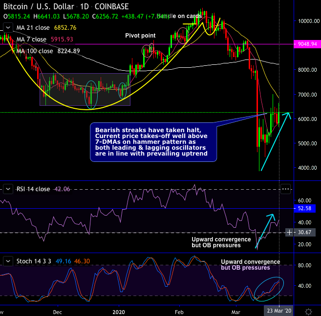 The bearish streaks of cryptocurrency markets in the recent times now seem to have taken a halt. The pioneer and world’s largest cryptocurrency, Bitcoin’s price (at Coinbase) has managed to breakout the $6.5k level briefly on 20th March.