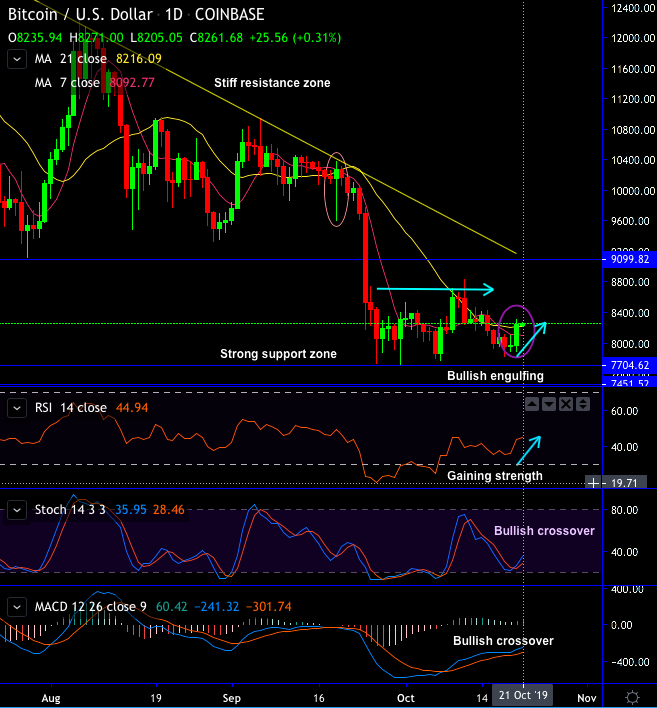 As you could refer to BTCUSD price chart of daily plotting, the stern bullish engulfing pattern candlestick has occurred at $8,236 levels and taken off rallies above 7-DMAs (daily chart), the intraday buying sentiments have also been intensified with bullish SMA & MACD crossovers and upward convergence to the price curve (refer 4H chart).