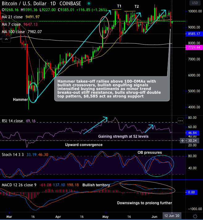 Technically, hammer pattern candle takes-off BTCUSD (at Coinbase) rallies above 100-DMAs with bullish crossovers, bullish engulfing signals intensified buying sentiments as minor trend breaks-out stiff resistance, bulls shrug-off double top pattern, 7, 21 & 100-DMA act as strong support (refer 1st chart).