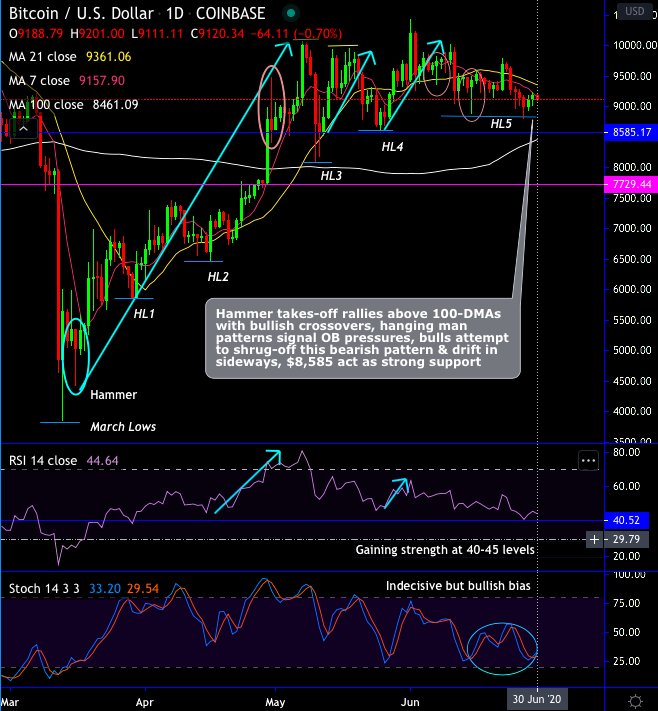 Technically, BTCUSD’s minor price trend (at Coinbase) is developing higher lows and hammer pattern at the bottom of $5,037 levels takes-off rallies above 100-DMAs with bullish crossovers. On the contrary, hanging man patterns pop-up at $9,750 and $9,432 levels to signal the overbought pressures, while bulls attempt to shrug-off these bearish patterns & drifting in sideways.