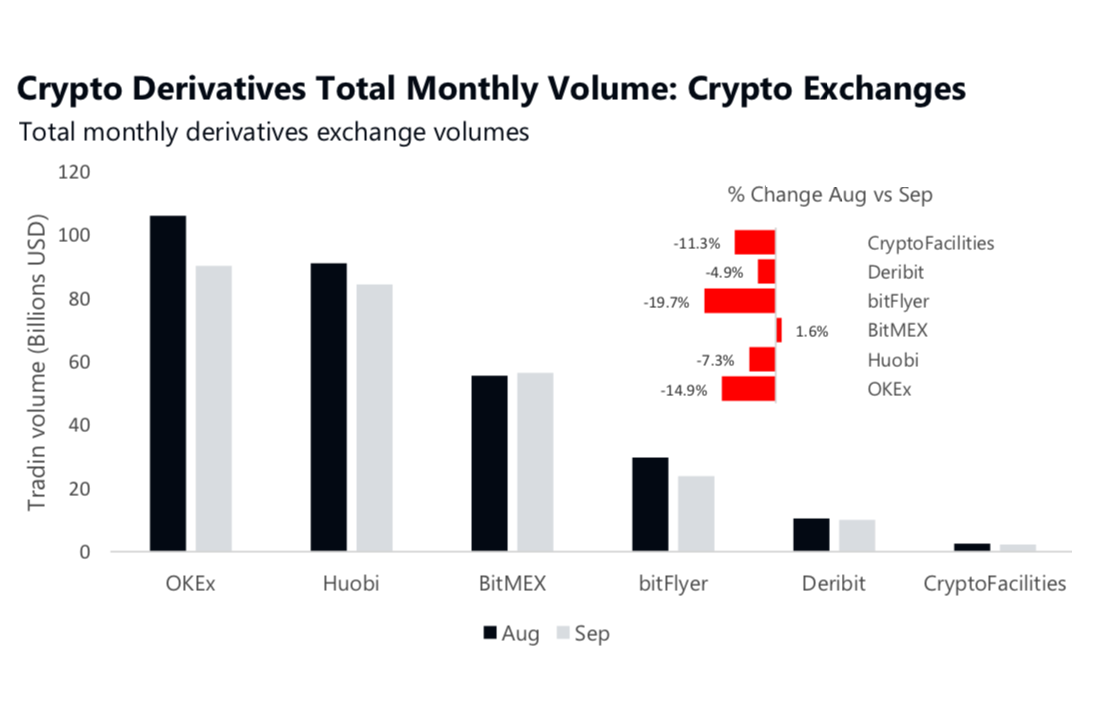 The regulated bitcoin derivatives product volumes are still dominated by CME, whose total trading volumes are down 18.3% from August at 4.82 billion USD.