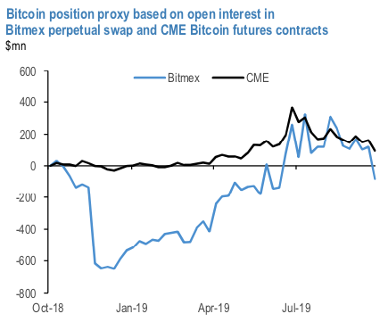 By contrast, the BitMEX position proxy suggests a more marked capitulation of bitcoin longs over the past week. This position liquidation has also likely contributed to the sharp falls in bitcoin prices this week. But while the previous overhang of long bitcoin futures positions appears to have cleared in Bitmex futures, this is not yet true for CME contracts.