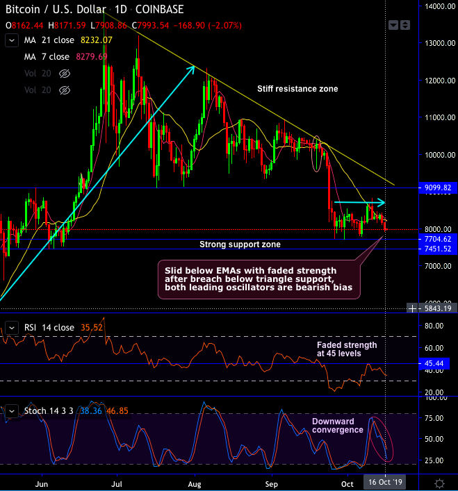 The pair (BTCUSD) has formed descending triangle pattern in its minor trend, it has now slid below EMAs (i.e. 8,253) with the faded strength after the breach below triangle support, while both the leading oscillators (RSI & stochastic curves) are still bearish bias. We too could still foresee more slumps on the cards in the near-terms, the above positions are to be upheld.