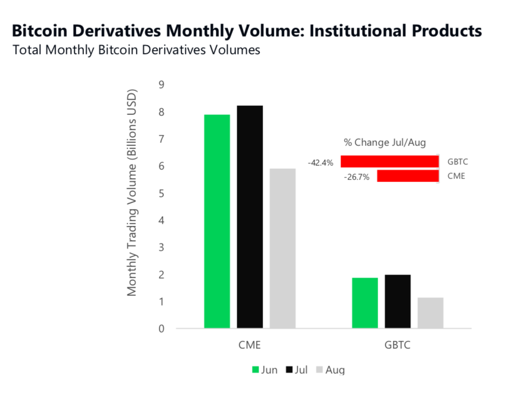 CME’s bitcoin futures product volumes decreased from a total of 8.06 billion USD traded in July to a total of 5.9 billion USD traded in August. Meanwhile, Grayscale’s bitcoin trust product (GBTC), decreased in terms of total trading volume with 1.14 billion USD traded in August (down 42.4% since July).