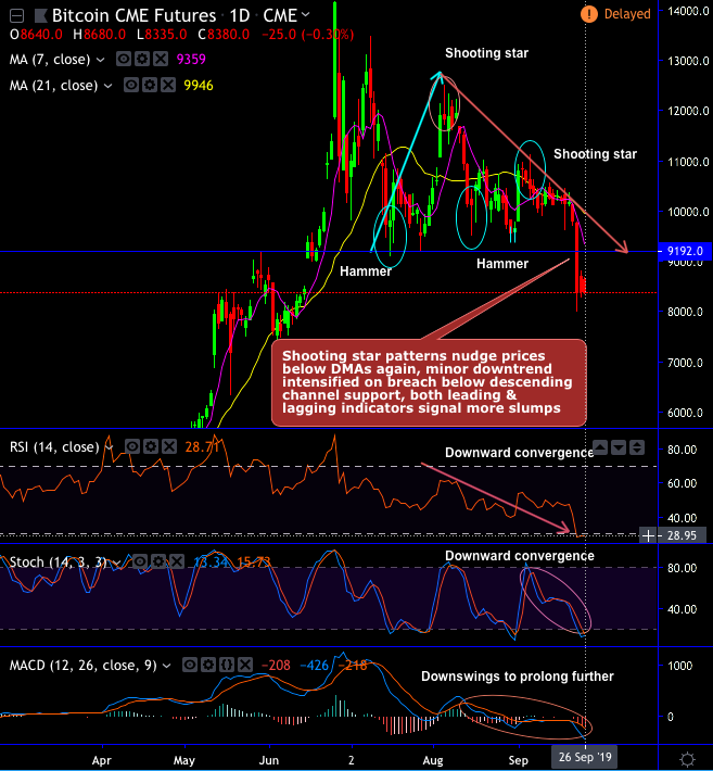 We also traced out shooting star patterns at $11,830 and $10.460 levels, consequently, the bears nudge the bitcoin futures prices below 7 & 21-DMAs again. Amid these bearish sentiments, the minor trend breaches below descending channel support which is again a bearish indication, thereby, the short-term rallies now seemed to have been absolutely exhausted.