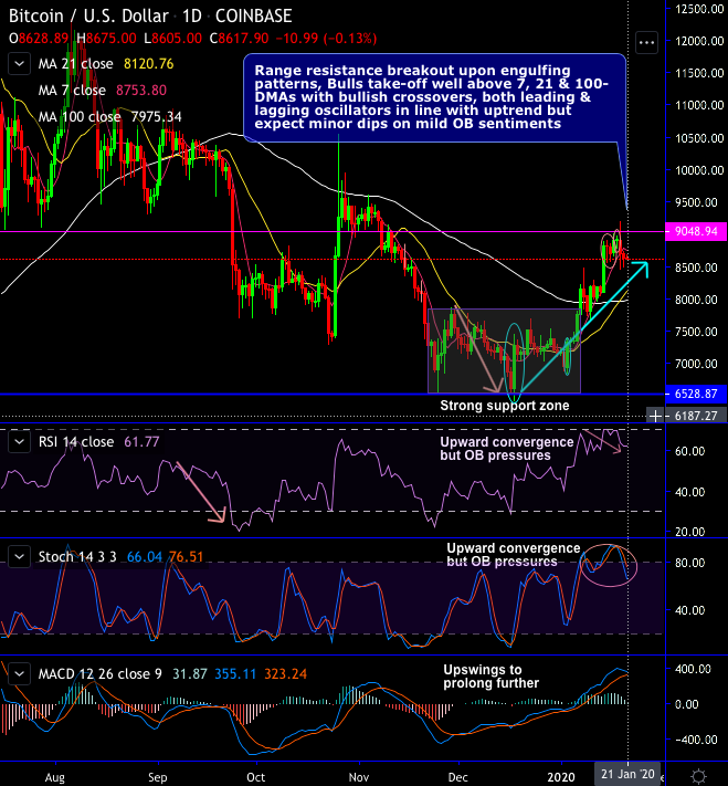 Bitcoin’s price (BTCUSD) has been drifting in sideways after two day’s corrections (i.e. more than -3%), while the overbought sentiment pauses BTCUSD rallies above $8,630 levels despite vigorous price slumps from the last two days.
