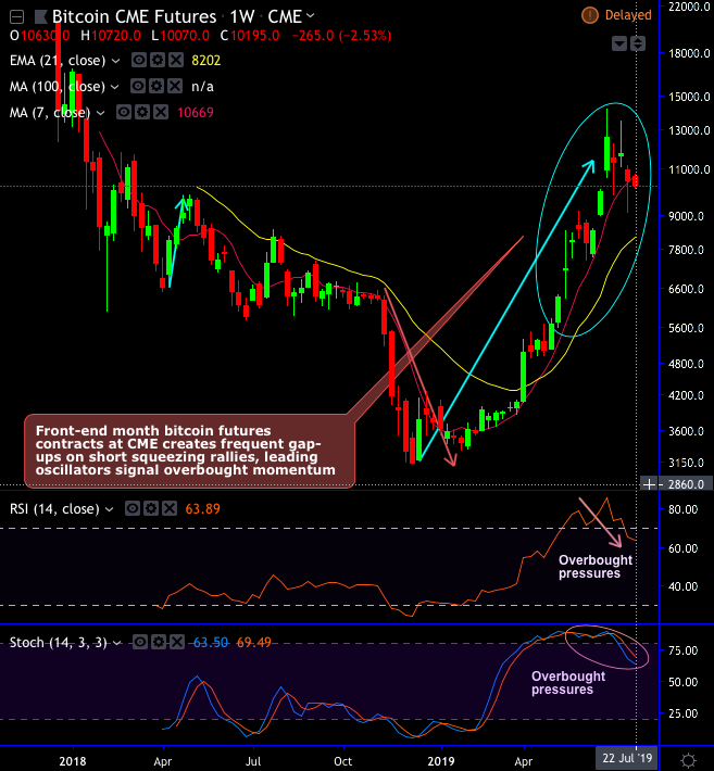 When we look at the technical charts of CME BTC futures of front-end month contracts, having risen so sharply and swiftly, one can easily make out that the pioneer cryptocurrency has created considerable gaps quite often if you plot the technical charts of CME’s Bitcoin Futures contracts of near month deliveries. It is nothing new but owing to the short squeeze trading activities. Hence, the pioneer cryptocurrency plummets towards $10,200 as selling pressure ramps up.
