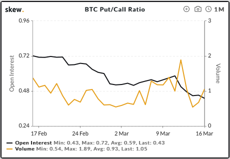 Usually, Put/Call ratio of below 0.7/0.8 has been perceived as a bullish indicator. The Put/Call ratio for Bitcoin Options is smack in the middle of that range suggesting that traders are poised for a price reversal.