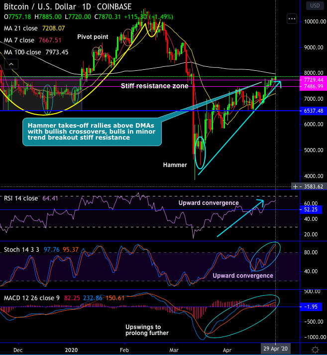 Technically, the pair (at Coinbase) has shown constant upswings in the minor trend ever since the occurrence of hammer pattern at $5,037 level. Today, it has broken out stiff resistance zone of $7.7k level and headed for next resistance of $7,974 levels (i.e. 100-DMAs) (refer 1st chart). Any decisive breakout above this level can bring in vigorous upside risks.