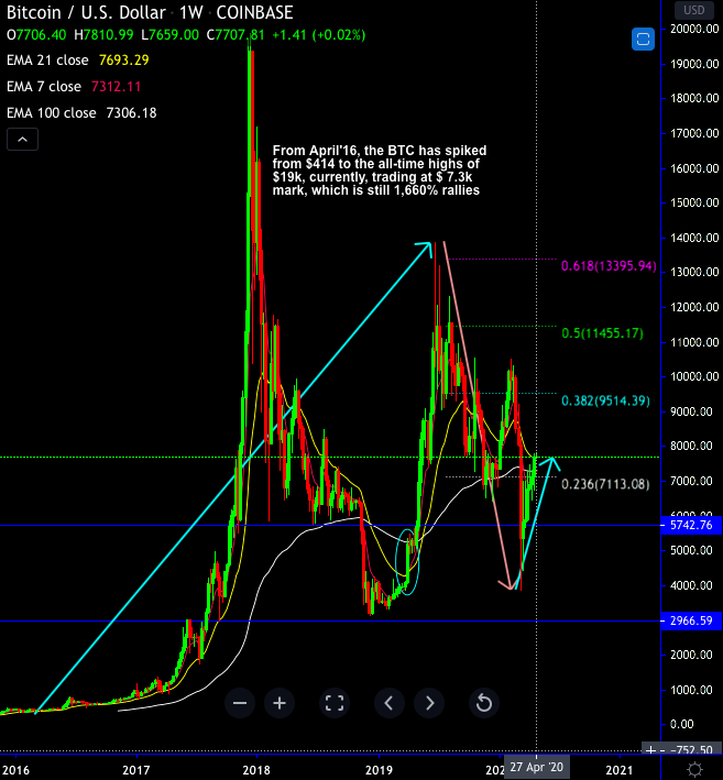 Bitcoin (BTC) price jumped more than 8% on a weekly basis, this has been the sixth consecutive weekly rallies as the price edged higher above $7,810 (at Coinbase).