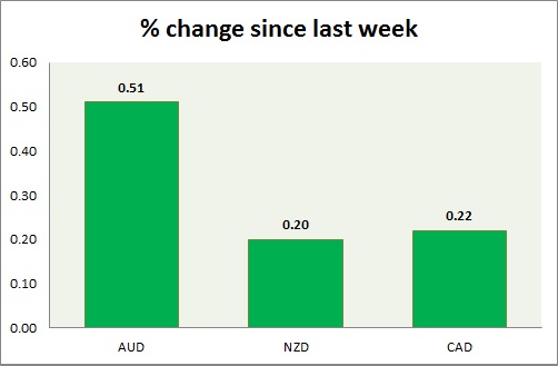 Strength meter (since last week) – Aussie +0.51%, Kiwi +0.20%, Loonie +0.22%
