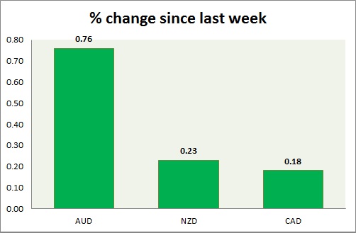 Strength meter (since last week) – Aussie +0.76%, Kiwi +0.23%, Loonie +0.18%