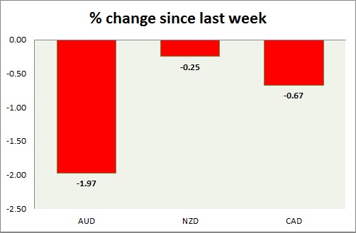 Strength meter (since last week) – Aussie -1.97%, Kiwi -0.25%, Loonie -0.67%