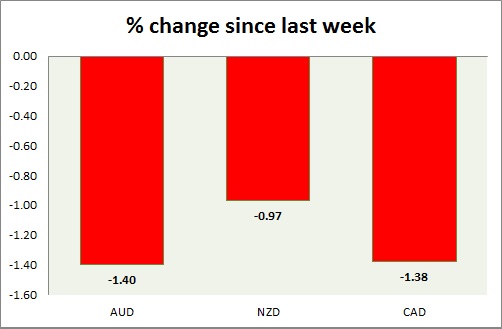 Strength meter (since last week) – Aussie -1.40%, Kiwi -0.97%, Loonie -1.38%