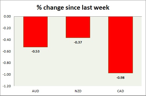 Strength meter (since last week) – Aussie -0.53%, Kiwi -0.37%, Loonie -0.98%