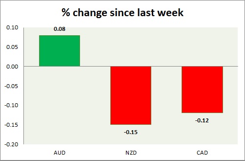 Strength meter (since last week) – Aussie +0.08%, Kiwi -0.15%, Loonie -0.12%