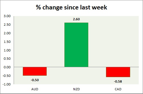 Strength meter (since last week) - Aussie -0.50%, Kiwi +2.60%, Loonie -0.58%.