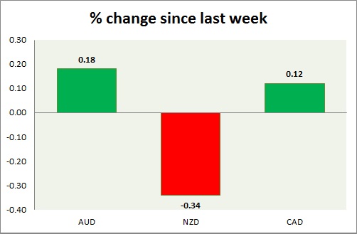 Strength meter (since last week) – Aussie +0.18%, Kiwi -0.34%, Loonie +0.12%