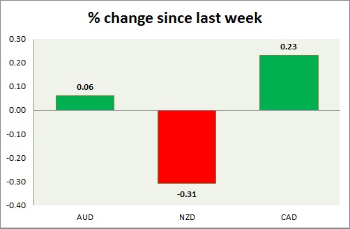 Strength meter (since last week) – Aussie +0.06%, Kiwi -0.31%, Loonie +0.23%