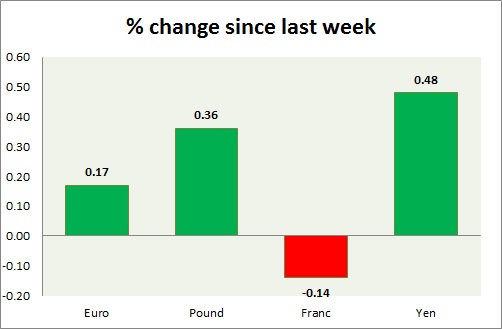 Strength meter (since last week) – Euro +0.17%, Franc -0.14%, Yen +0.48%, GBP +0.36%