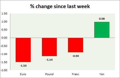 Strength meter (since last week) – Euro -1.50%, Franc -0.90%, Yen +0.98%, GBP -1.14%
