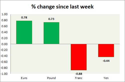 Strength meter (since last week) – Euro +0.78%, Franc -0.88%, Yen -0.44%, GBP +0.73%