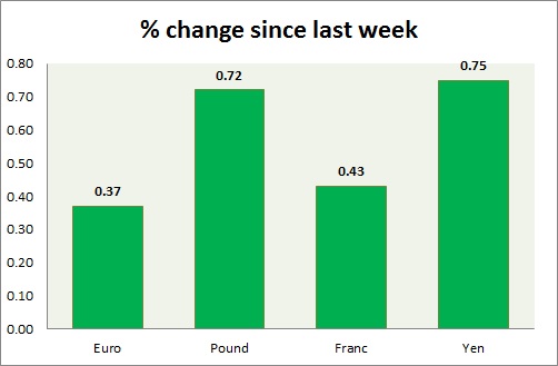 Strength meter (since last week) – Euro +0.37%, Franc +0.43%, Yen +0.75%, GBP +0.72%
