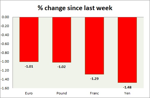 Strength meter (since last week) – Euro -1.01%, Franc -1.29%, Yen -1.48%, GBP -1.02%