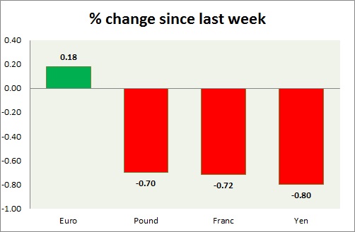 Strength meter (since last week) – Euro +0.18%, Franc -0.72%, Yen -0.80%, GBP -0.70%