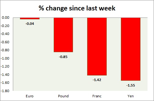 Strength meter (since last week) – Euro -0.04%, Franc -1.42%, Yen -1.55%, GBP -0.85%