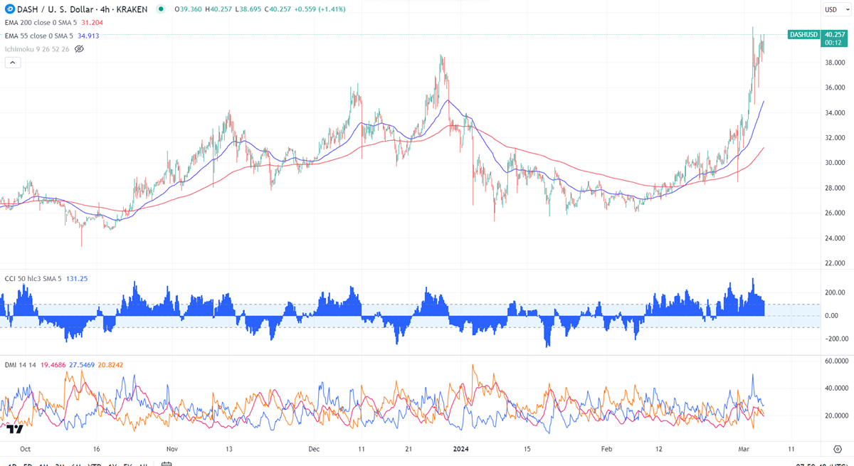 DASHUSD surged more than 27% in this month. It holds above the short-term (21 and 55 EMA) and above the long-term moving average. It hit a high of $40.83 and is currently trading around $40.25.