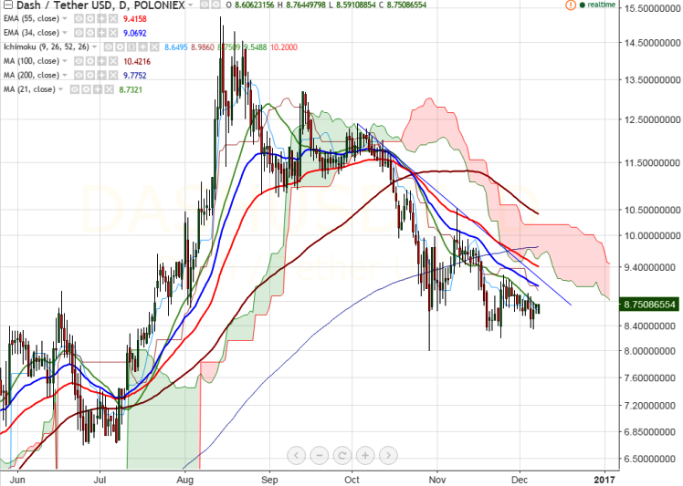 DASH/USDT has recovered slightly after making a low of USDT8.34 (Poloniex). It is currently trading around USDT8.72 at the time of writing.