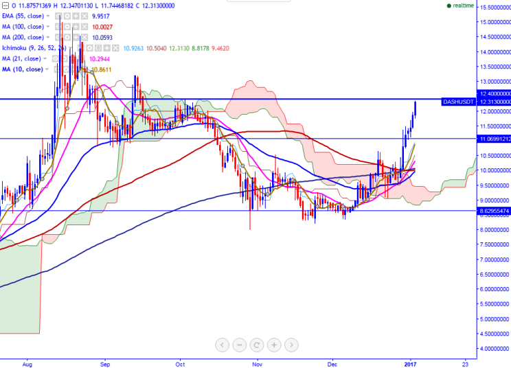 DASH/USDT pair has broken minor resistance at USDT12 and jumped till USDT12.34 (Poloniex). DASHUSDT is trading well above short term and Long term MA. So the long term trend is slightly bullish. It is currently trading around USDT12.4.