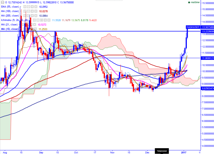 DASH/USDT continues to trade well above on Wednesday. The pair has broken major resistance at USDT13.40 and jumped till USDT13.59 (Poloniex). DASH/USDT hits three months high and is trading slightly above USDT13 and is expected to trade higher in coming months. It is currently trading around USDT13.75 at the time of writing.