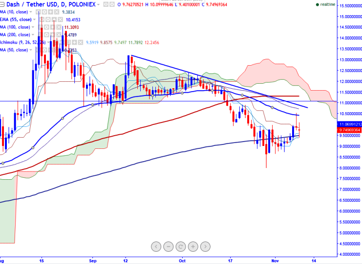 DASH/USDT pair has recovered slightly from the low of USDT9.40 (Poloniex). It is currently trading around USDT9.75 at the time of writing.