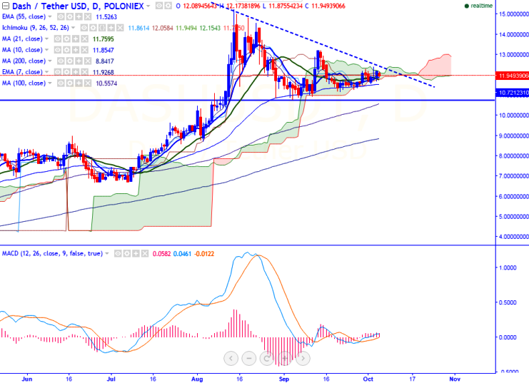 DASH/ USDT is seen struggling to trade above on Wednesday. The pair has once again retreated after jumping till USDT12.19 yesterday (Poloniex). It is currently trading around USDT11.94 at the time of writing.