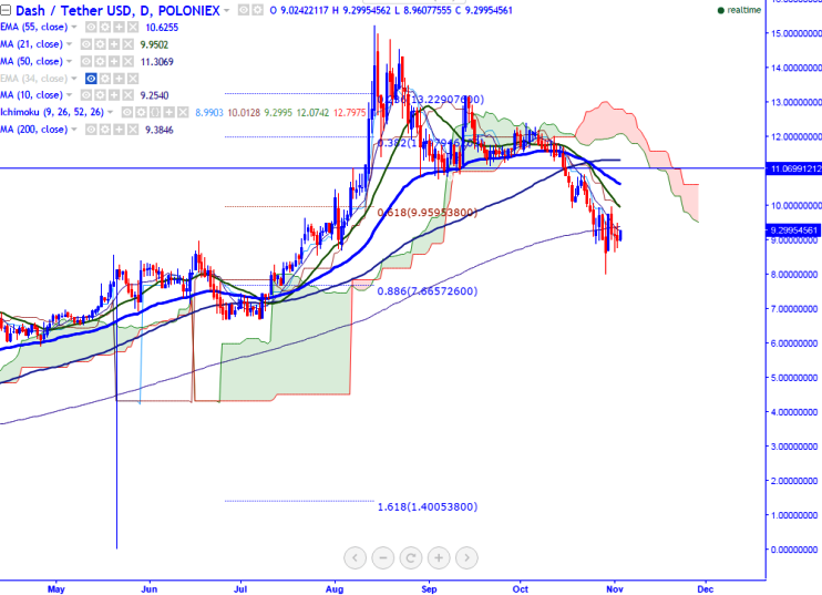 DASH/USDT is seen trading above on Thursday. The pair jumped slightly till USDT9.49 after hitting the low of USDT8.77 yesterday (Poloniex). It is currently trading around USD9.29 at the time of writing.