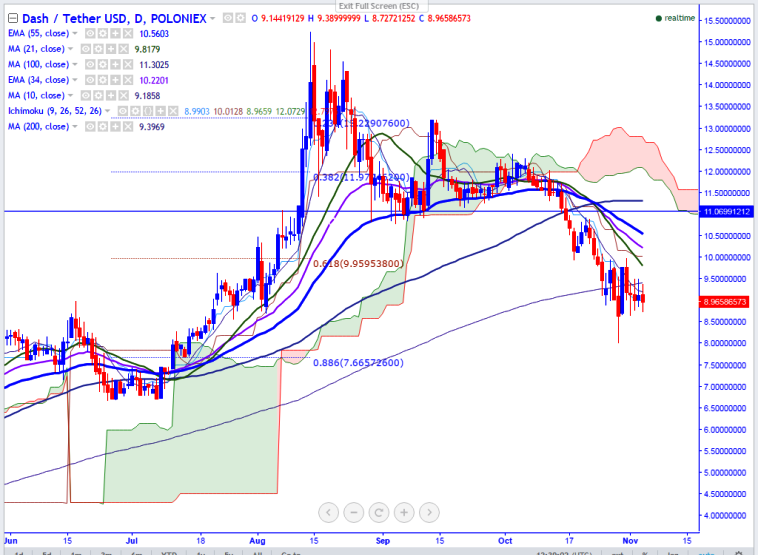 DASH/USDT is trading in narrow range between USDT9.49 and USDT8.64 for the past three trading session (Poloniex). It is currently trading around USD8.96 at the time of writing.