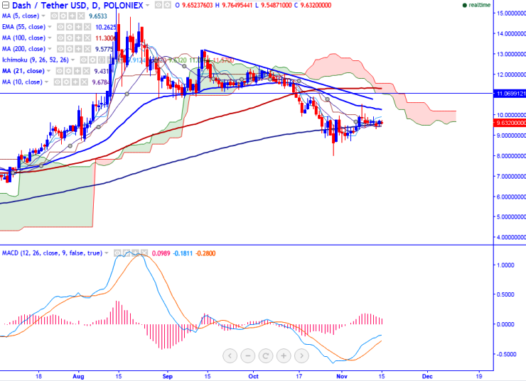 Major resistance is seen at USDT9.87 (daily Tenken-Sen) and any break above targets USDT10.28 (55- day EMA)/USDT11.30 (100- day MA). Short-term support is around USDT9.56 (200 –day MA) and any break below targets USDT8.64 (Nov 11th, 2016 low) /USDT8 (Oct 29th, 2016 low)/USDT6.70 (7th Jul low).