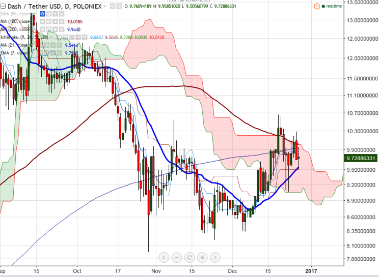 DASH/USDT has broken major support USDT10.03 (100- day MA) and declined till USDT9.50 levels (Poloniex). It is currently trading around USDT9.70 at the time of writing.